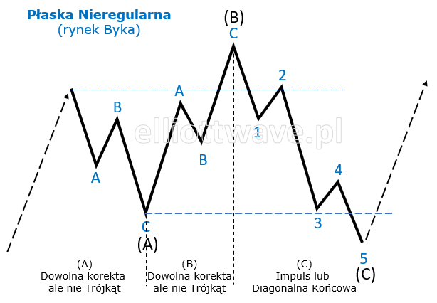 Płaska Nieregularna (lub Rozszerzająca się) różni się od Regularnej tym, że fala B przekracza początek fali A, co oznacza, że B znosi więcej niż 105% długości fali A. W takich przypadkach fala C często osiąga 1,618 lub 2,618 długości fali A, co wskazuje na silny impuls rynkowy w przeciwnym kierunku do głównego trendu. To powoduje dynamiczny ruch fali C. Składa się z 3 fal, a jej wewnętrzna struktura to 3-3-5.