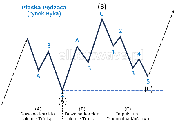Płaska Pędząca jest podobna do Płaskiej Nieregularnej, ponieważ fala B przekracza początek fali A, ale fala C nie przekracza końca fali A. Ten typ formacji sugeruje, że rynek porusza się w bardzo silnym trendzie, ponieważ fala C nie jest w stanie wyjść poza koniec fali A. Jest to rzadka formacja, która zwykle wskazuje na szybki powrót do dominującego trendu. Składa się z trzech fal, a jej wewnętrzna struktura to 3-3-5.