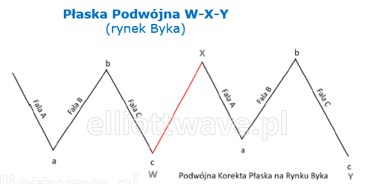 Płaska Podwójna to bardziej złożona forma korekty, która powstaje, gdy dwie formacje Płaskie są połączone przez falę korekcyjną (zwaną falą łączącą X, najczęściej w formie Zygzaka). Struktura tej formacji przypomina kombinację dwóch odrębnych Płaskich, połączonych falą korekcyjną typu X. Płaska Podwójna nie różni się znacząco pod względem strukturalnym od pojedynczej Płaskiej, ale ze względu na swoją złożoność, ma tendencję do wydłużenia w czasie, co sprawia, że może być trudniejsza do identyfikacji.