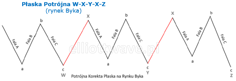Płaska Potrójna to jeszcze bardziej złożona forma korekty niż Płaska Podwójna. Składa się z trzech formacji Płaskich, połączonych dwoma falami korekcyjnymi (zwanymi falami łączącymi X). Każda z trzech Płaskich może być Płaską Regularną, Nieregularną lub Pędzącą. Fale X, które łączą poszczególne Płaskie, najczęściej przyjmują formę Zygzaka, choć mogą również przybrać inne formy korekcyjne. Płaska Potrójna jest dość rzadka, ale gdy występuje, sygnalizuje dłuższy okres konsolidacji lub korekty bocznej na rynku.